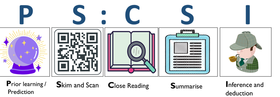 From English to P.E, Statistics to Science, our whole school reading strategy is PS:CSI. This is a series of reading tasks which aim to help our students decipher texts and analyse key words (as well as developing their previous knowledge). PS:CSI can be used anywhere whilst our students are reading (at home or in school). To encourage your child to read, you can use the helpful guide to PS:CSI below and assist them in their understanding of words and language.